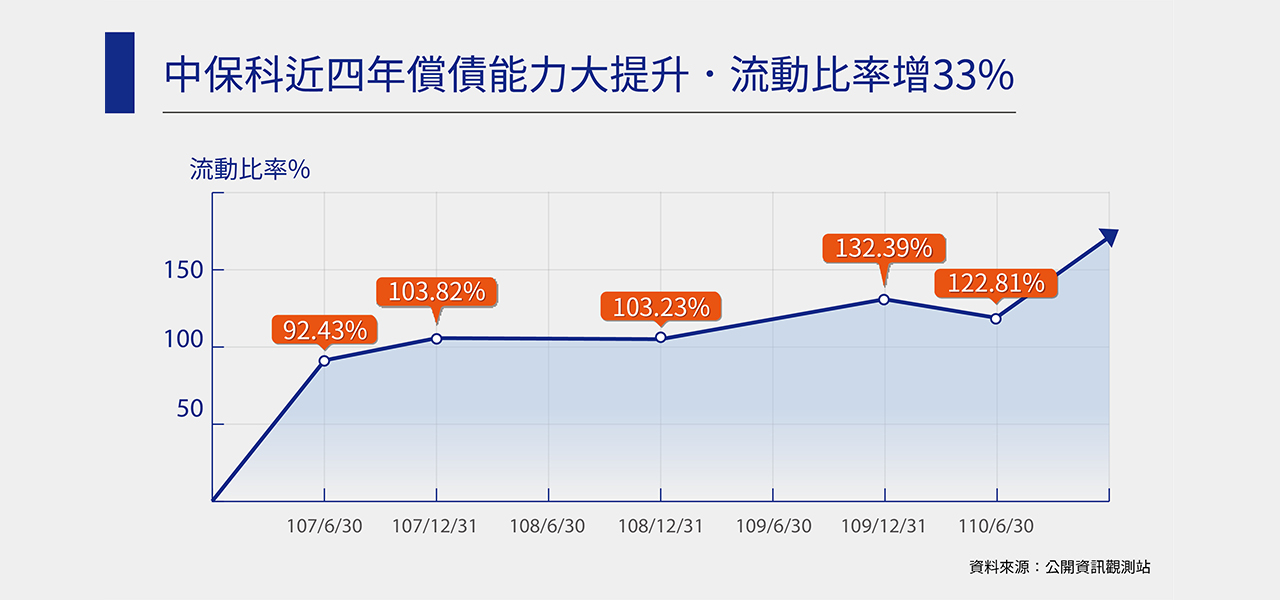 營運資金增加,也讓公司具備極佳的償債能力。看看110年公布的的半年報,中保科半年合併財報中流動比也出爐來到123%,創下歷年新高比例,近三年流動比率也大幅提升達33%。