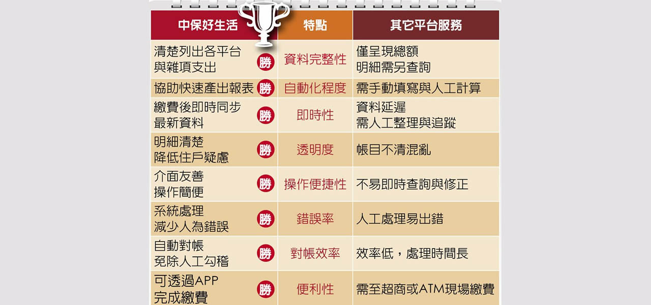 台北中山區管理約80戶的社區主委陳先生就表示:「以前光是管理費作帳就要花上一整天,現在只要30分鐘!」此一轉變,正是《中保好生活-財務報表》功能帶來的顯著成效。