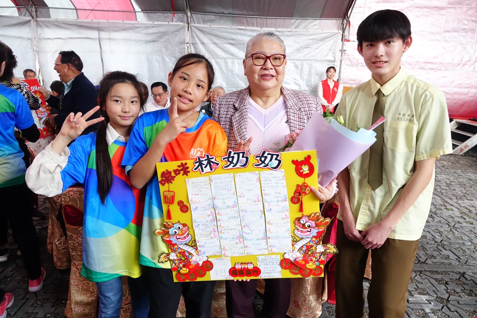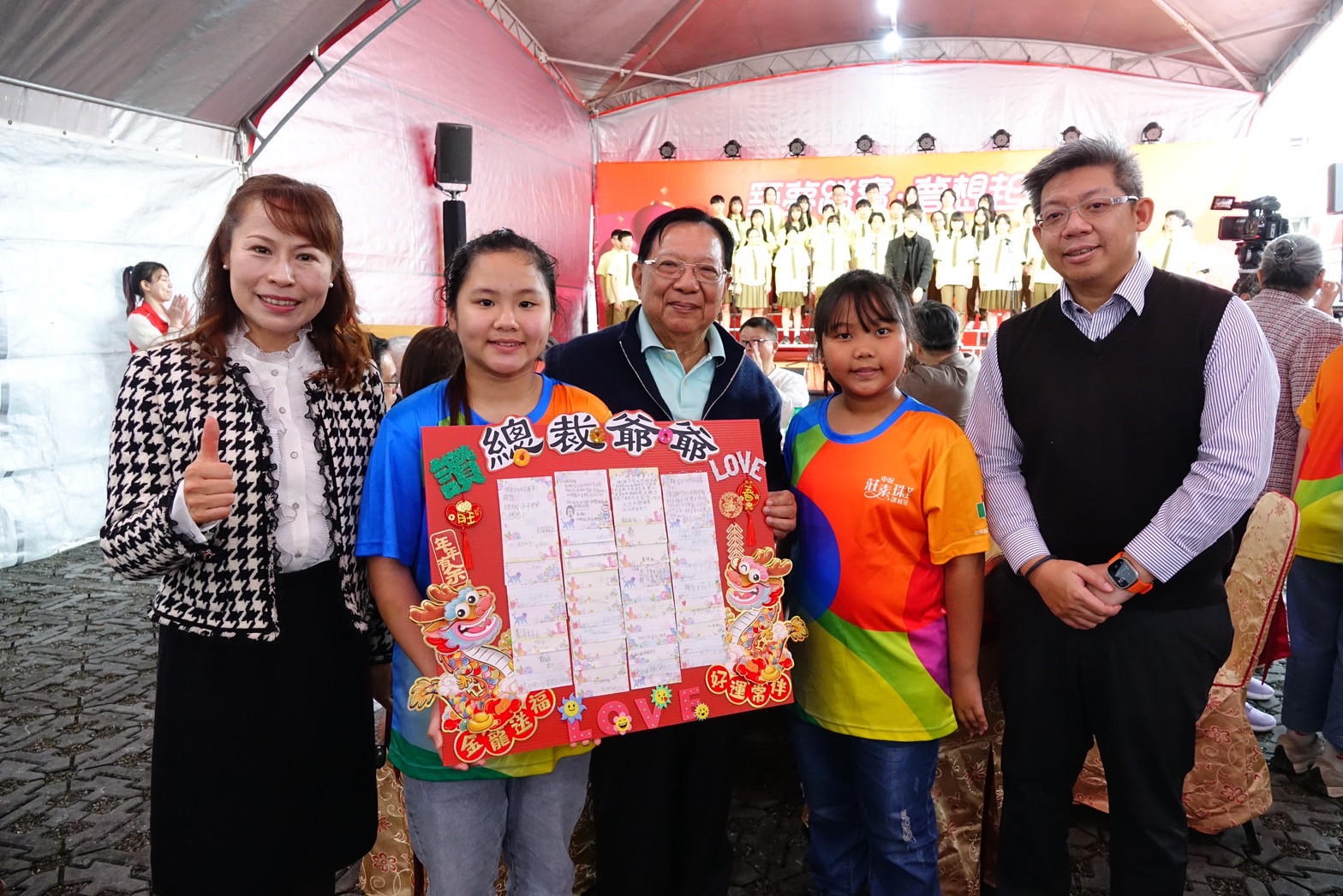中保課輔班的學童們特別手製卡片前來,獻給他們最愛的總裁爺爺和執行長奶奶。