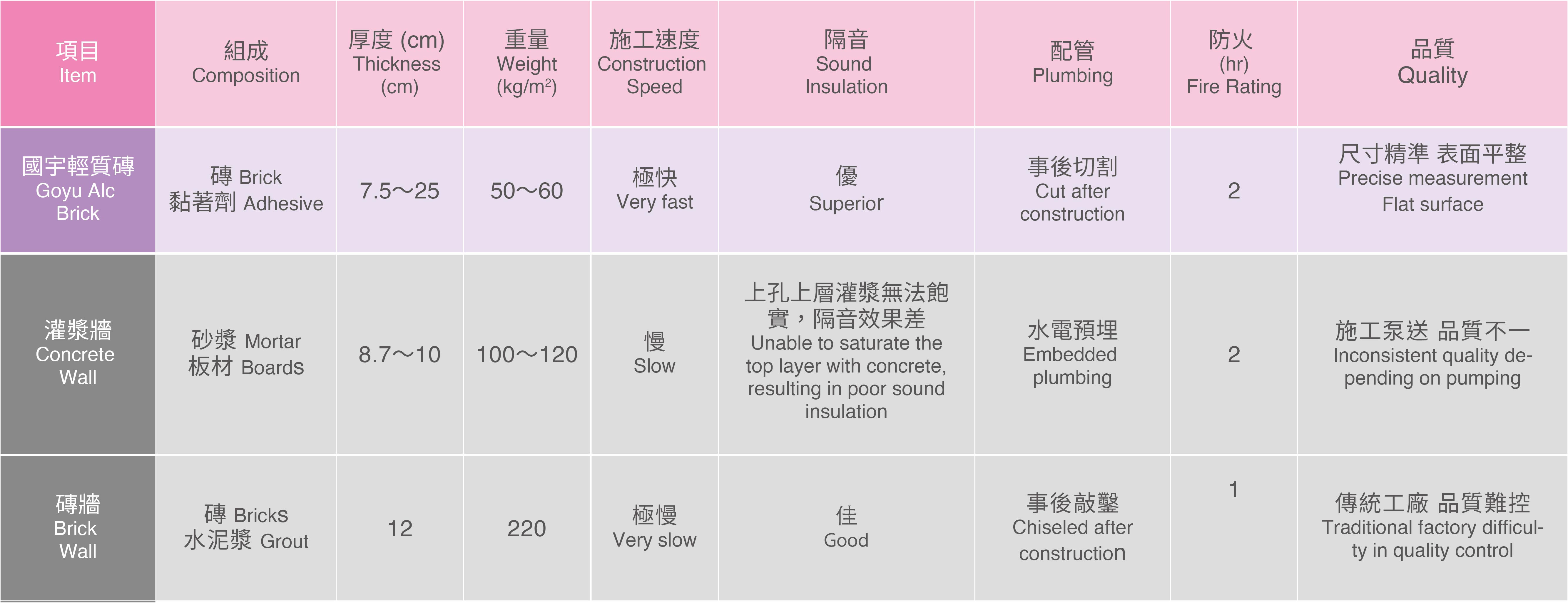 相較於其他隔間建材,ALC輕質磚整體重量較輕,重量更不到傳統磚牆的4分之1,搬運更省人力,也便於裁切,使用輕質磚專用黏著劑,即可將其縝密接合,不留縫隙、施工快速,有效改善施工效率,更不易造成建物負重增加,是最輕質堅固的實心牆。